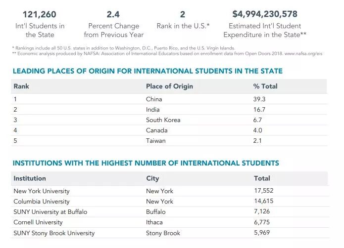 上文已经提到,在加州的中国人占到总国际生的41.1%,而作为国际生最爱的纽约,中国学生也占到了39.3%。其中大多数国际生都就读于纽约大学,哥伦比亚大学,纽约州立大学布法罗分校和康奈尔大学。