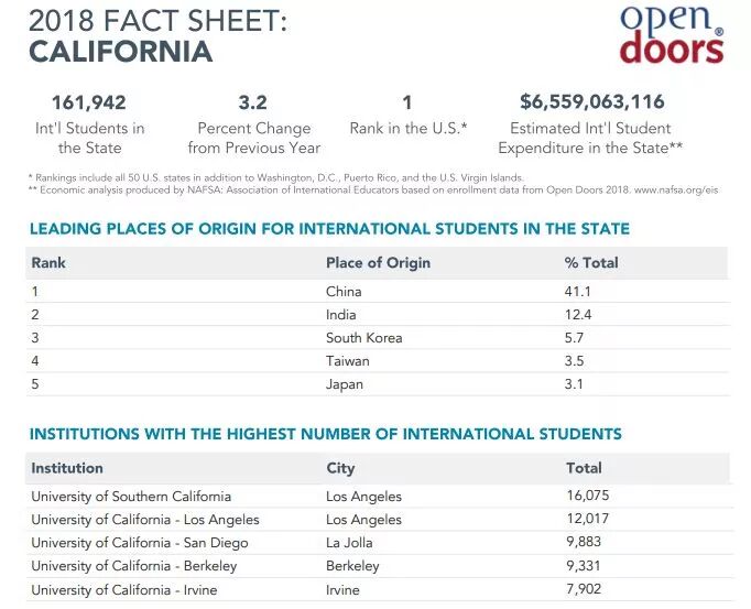 我们可以看到加州大学系所占的国际生比例和数量还是很高的。而在加州的中国人占到总国际生的41.1%