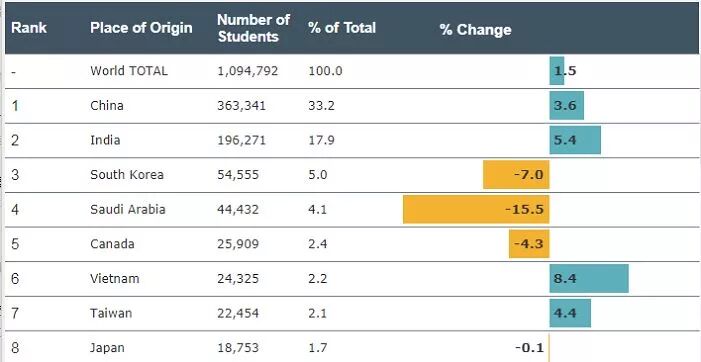 很多中国学生在美国都会认识印度同学和韩国同学,作为三大生源国,中国学生总数大约是印度学生的2倍,而韩国学生的近7倍。