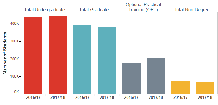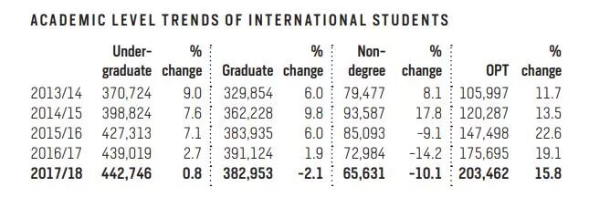 攻读非学位课程(包括短期交流和英语强化课程)的人数减少了10%。处于OPT实习期的留学生人数增加了15.8%(OPT,全称Optional Practical Training,是专门为持有美国F1学生签证的学生提供在毕业后的一段实习期,留美期限因专业而异)