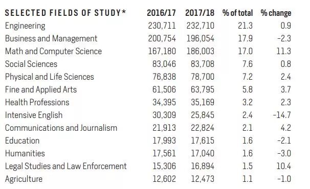 STEM依然是热门专业,工程专业就读人数去上一学年增加0.9%,虽然工程专业看起来增加不多,但是依旧占到总人数的21.3%。