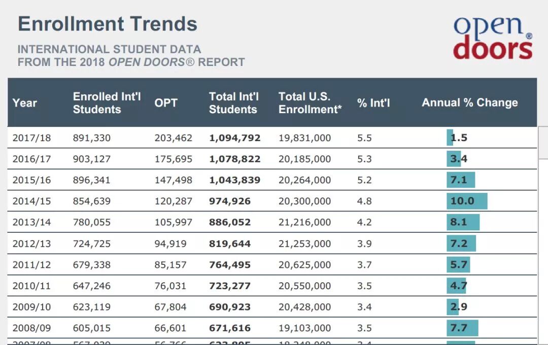11月13日,美国国际教育协会IIE发布了最新的《2018美国门户开放报告》。根据2018年《美国开放门户报告》,在2017到2018学年中,在美国学习的国际学生人数达到有史以来的最高109万人。