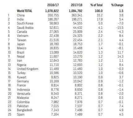中国依然是最大生源国 中国仍然是排名第一的国家,2016/17年度留美人数超过35万,而2017/18年,中国学生的数量是36万人,增长了3.6%。中国学生数量庞大,占到全部国际生数量的33.2%。