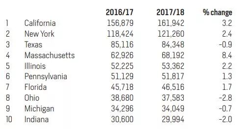 留学生人数最多的美国州 吸引留学生最多的州是加州、纽约州、德克萨斯州、马萨诸塞州、伊利诺伊州、宾夕法尼亚州、佛罗里达州、俄亥俄州、密歇根州和印第安纳州。我们可以看到,前五名除了德克萨斯州的国际生人数相对减少了0.9%以外,其他州的人数都有所增加。