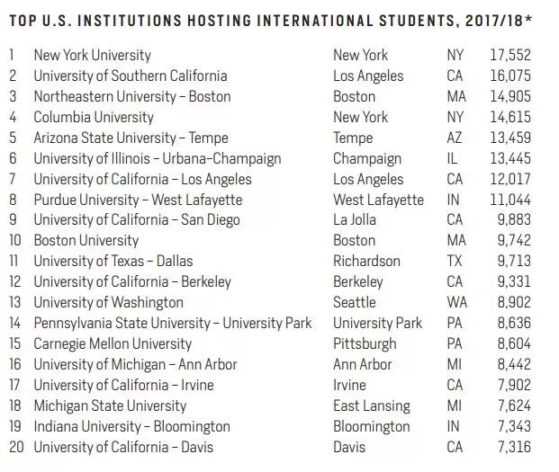 前十名还有:东北大学、哥伦比亚大学、亚利桑那州立大学、伊利诺伊大学香槟分校、加州大学洛杉矶分校、普渡大学西拉法叶分校,加州大学圣地亚哥分校和波士顿大学。我们可以看到,这前十名的国际生数量总共占比11%。