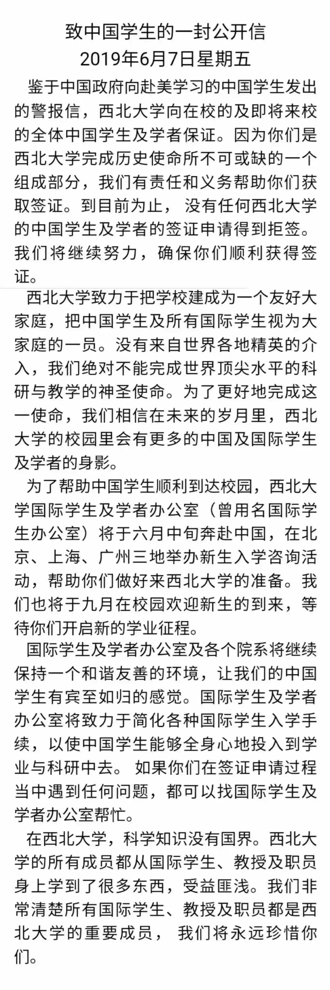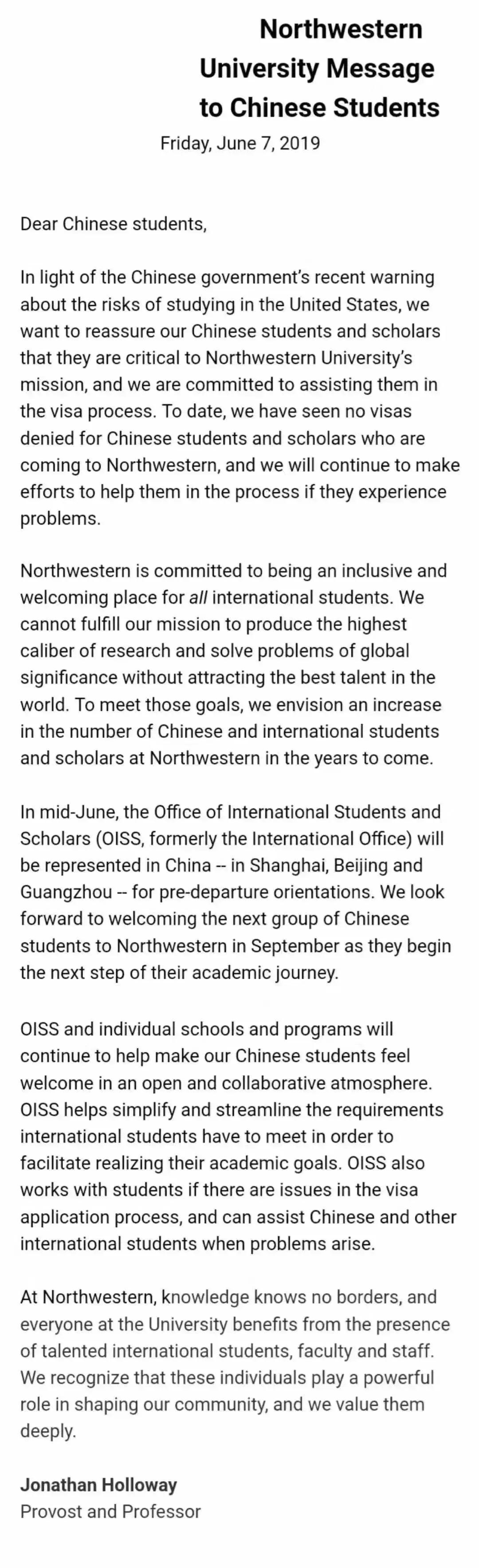 2019年6月7日,录取西北大学的中枢学员收到一封来自西北大学国际学生办公室的邮件,并在信中强调:
