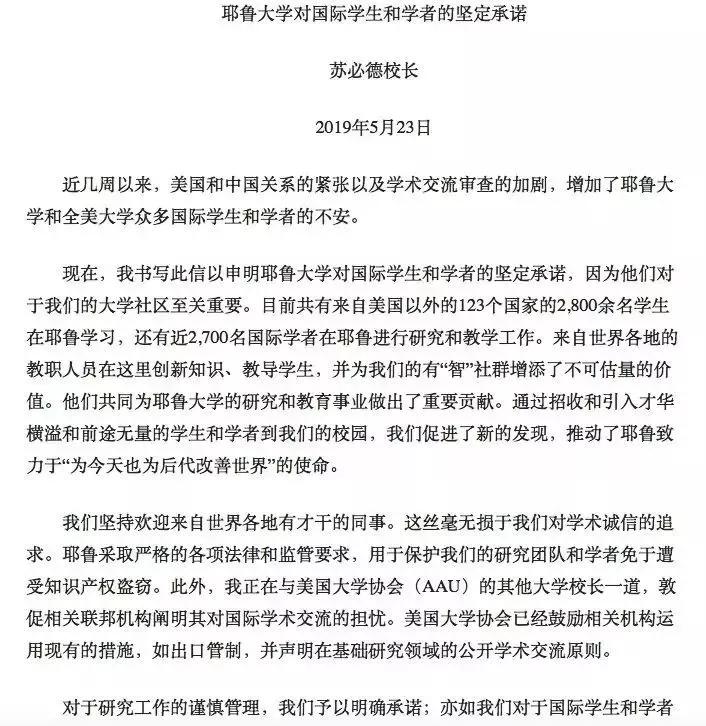 5月23日,耶鲁大学校长苏必德发表了一封公开信,信中直接指出在中美关系紧张的情况下,耶鲁大学再次明确对国际学生和学者的坚定承诺,强调来自世界各地的学生和学者对保持耶鲁大学学术水平和实现耶鲁大学。