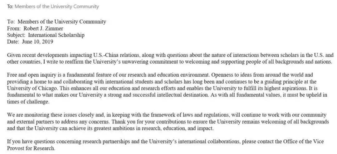 芝加哥大学官方致中国留学生一封信,表示对中国留学生的欢迎。
