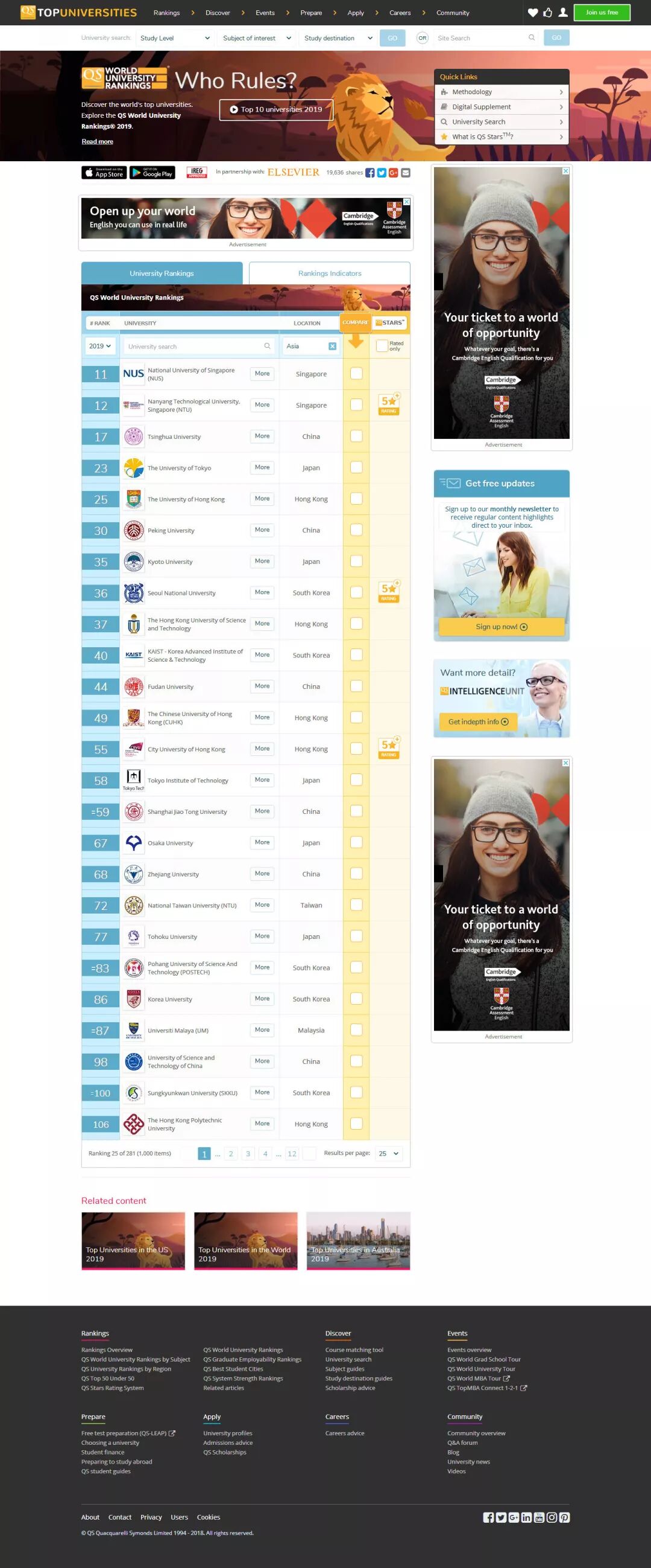跻身2019QS世界排名前50的12所亚洲的大学中,香港占了四分之一席位,香港大学、香港科技大学、香港中文的大学均在列。